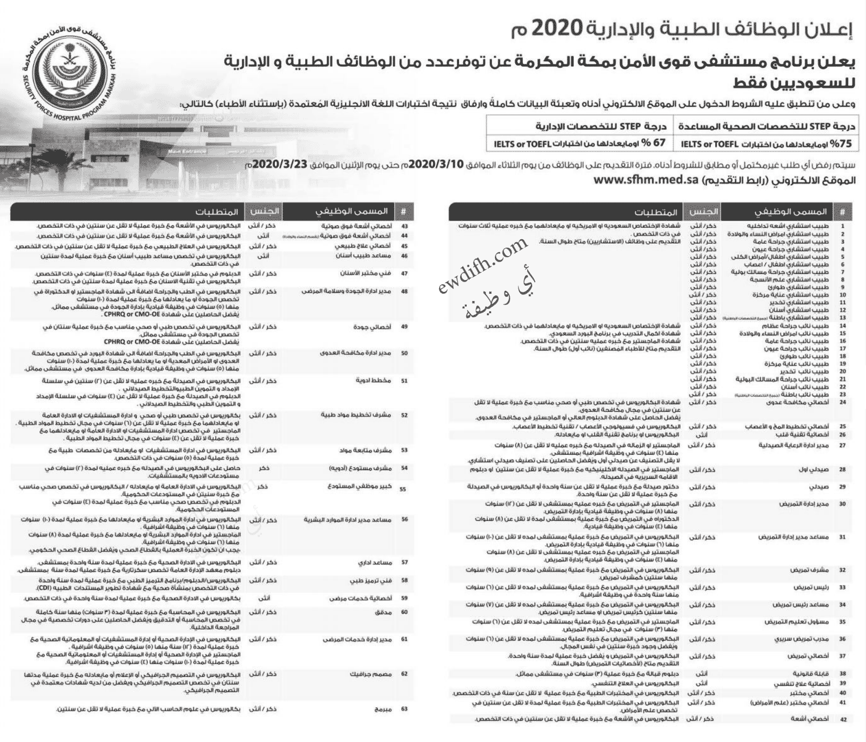 قام مستشفى قوى الأمن بمكة المكرمة بالاعلان عن توفر أكثر من 60 وظيفة إدارية وطبية للعام الحالي للجنسين وذالك حسب الموضح في الاسفل