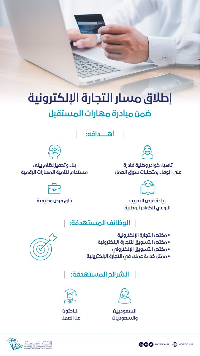 قامت وزارة الإتصالات وتقنية المعلومات في إطار مبادرة (مهارات المستقبل)، إطلاق (مسار التجارة الإلكترونية) بالشراكة مع القطاع الخاص لتوظيف وتدريب وارشاد الكوادر الوطنية وتعزيز جاهزيتها في المجالات المهنية الرقمية، وذلك وفقاً للتفاصيل الموضحة أدناه.