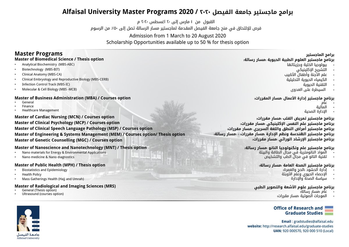 قامت جامعة الفيصل بالاعلان عن بدء التسجيل في برامج الماجستير للعام الحالي حسب التفاصيل الموضحه في الاسفل