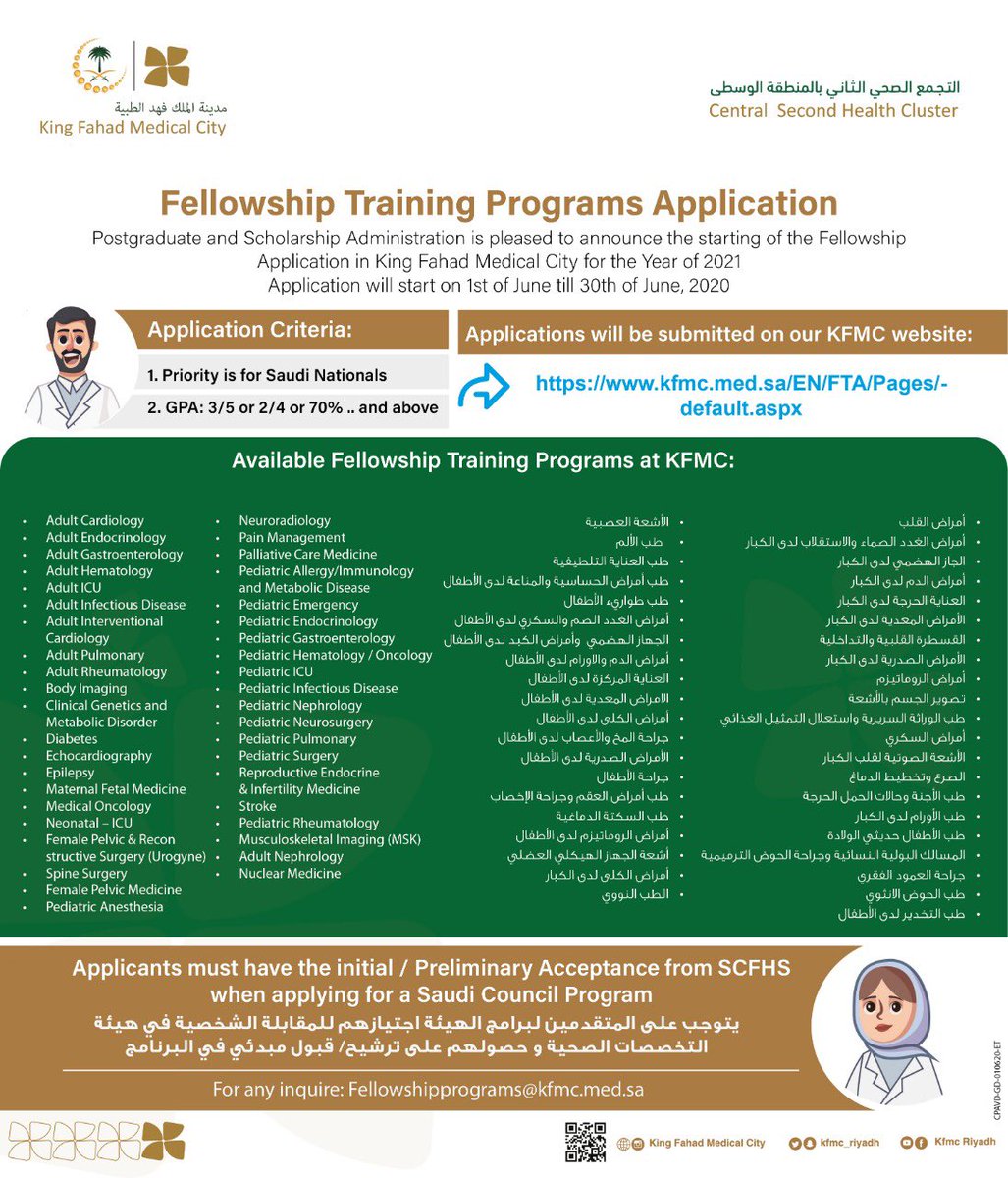 أعلنت مدينة الملك فهد الطبية عن برامج التخصصات الدقيقة للعام الأكاديمي 2021م، واشترطت المدينة على المتقدمين لبرامج الهيئة اجتيازهم للمقابلة الشخصية في هيئة التخصصات الصحية وحصولهم على ترشيح / قبول مبدئي في البرنامج، وذلك وفقاً لبقية التفاصيل الموضحة أدناه.