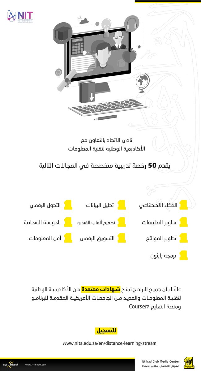 قام نادي الإتحاد السعودي ضمن برامج المسؤولية الاجتماعية عدد 50 فرصة تدريبية بالتعاون مع الأكاديمية الوطنية لتقنية المعلومات، ويحصل من خلالها المتدرب على رخصة تدريبية متخصصة في مجال الإتصالات وتقنية المعلومات، وذلك وفقاً للتفاصيل الموضحة أدناه.
