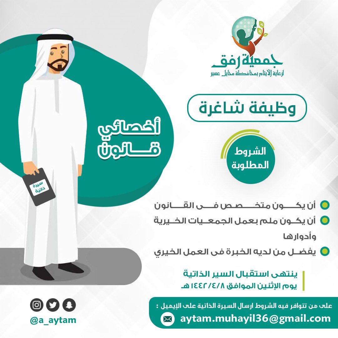 قامت الجمعية الخيرية لرعاية الأيتام بمحايل عسير بالاعلان عن فرص وظيفيه للرجال وذالك حسب التفاصيل الموضحه في الاسفل