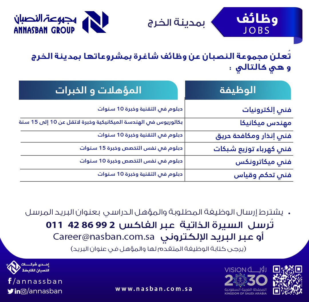 أعلنت مجموعة النصبان توفر 6 وظائف شاغرة لحملة الدبلوم فما فوق، للعمل بمشاريع الشركة بمحافظة الخرج، واشترطت الشركة أن يكون المتقدم سعودي الجنسية، وذلك وفقاً للشروط ومسميات الوظائف الموضحة أدناه.