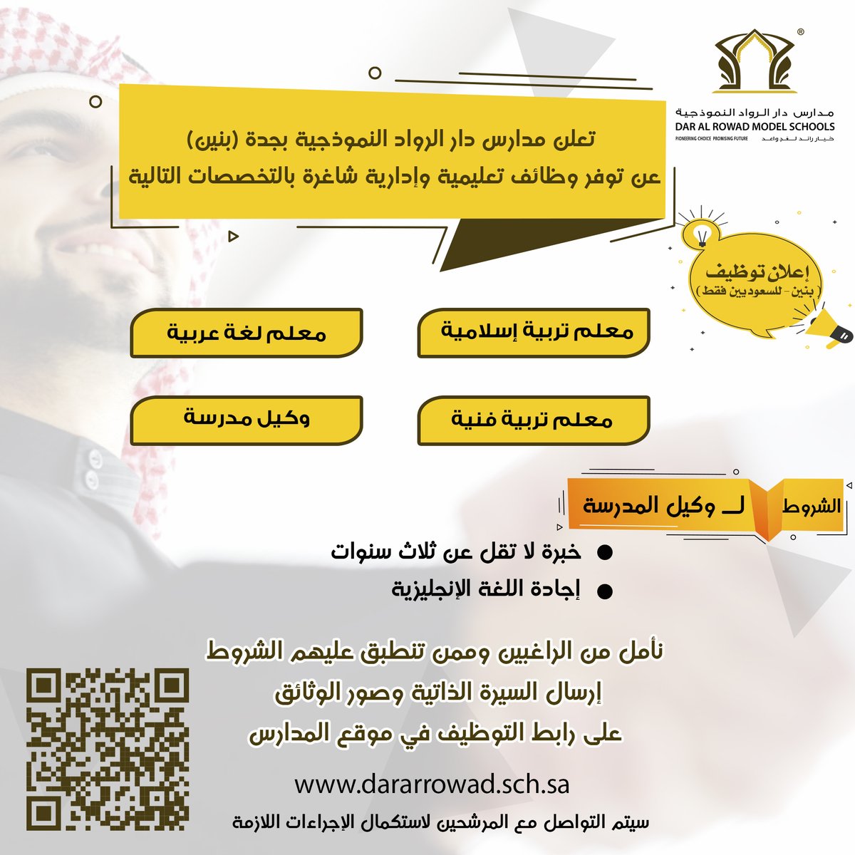 فرص وظيفية قامت مدارس دار الرواد النموذجية (بنين) بمحافظة جدة بالاعلان عنها للرجال و ذلك حسب التفاصيل والمسميات الموضحه في الاسفل