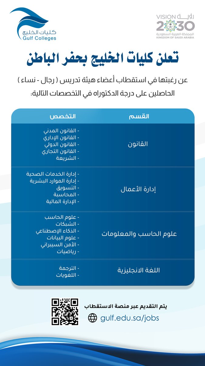 فرص وظيفية قامت كليات الخليج بحفر الباطن بالاعلان عنها للرجال و النساء في الرياض و ذلك حسب التفاصيل والمسميات الموضحه في الاسفل