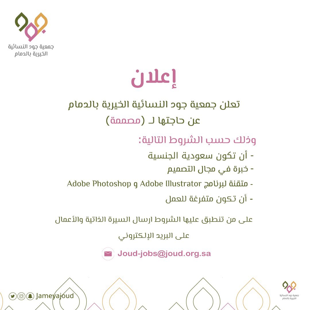 قامت جمعية جود النسائية الخيرية بالدمام توفر وظيفة نسائية شاغرة بمجال التصميم، للعمل بمسمى (مُصممة جرافيك)، وذلك وفقاً للتفاصيل الموضحة أدناه.
