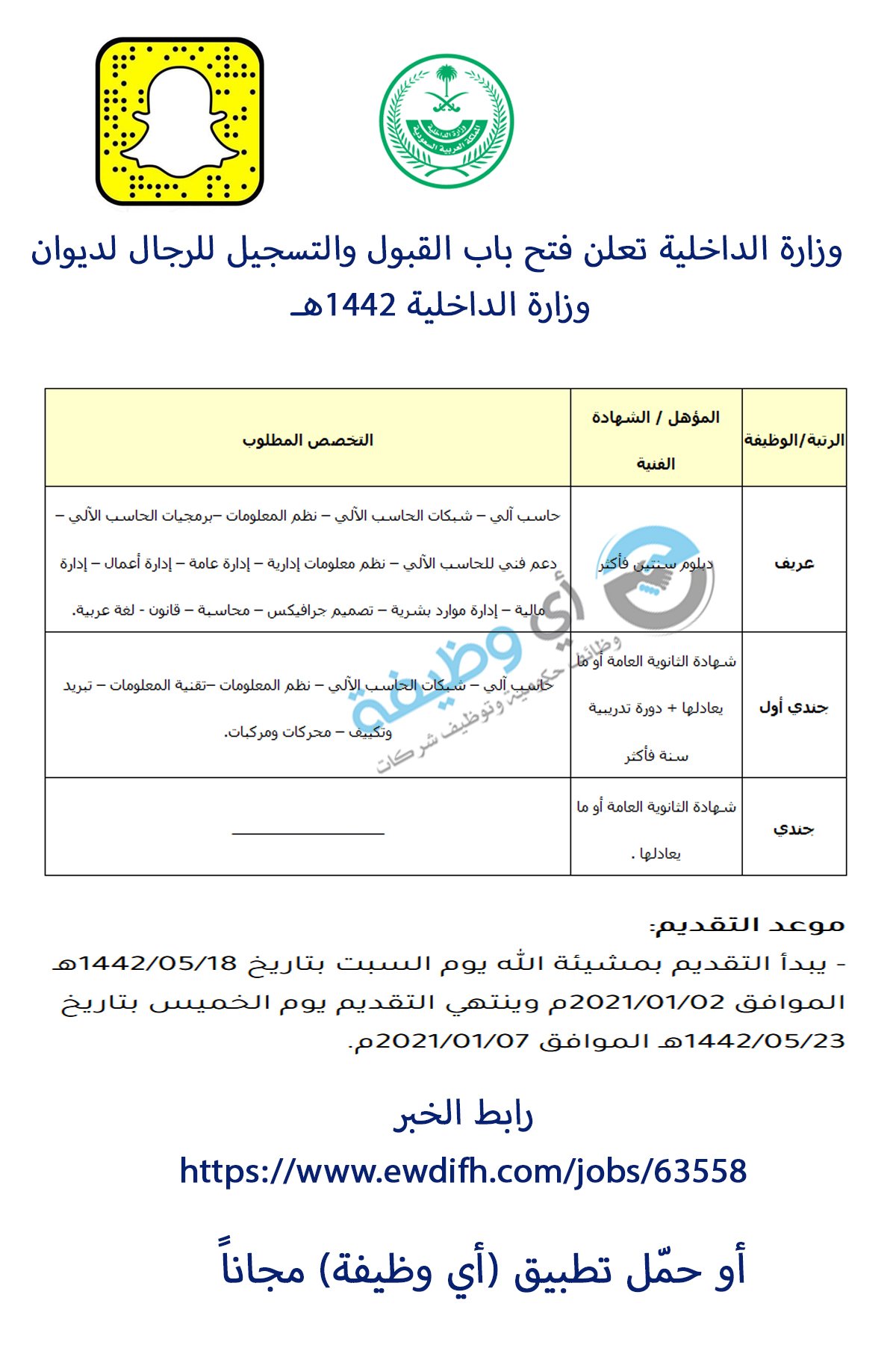 وزارة الداخلية تعلن فتح باب القبول والتسجيل للرجال لديوان وزارة الداخلية 1442هـ